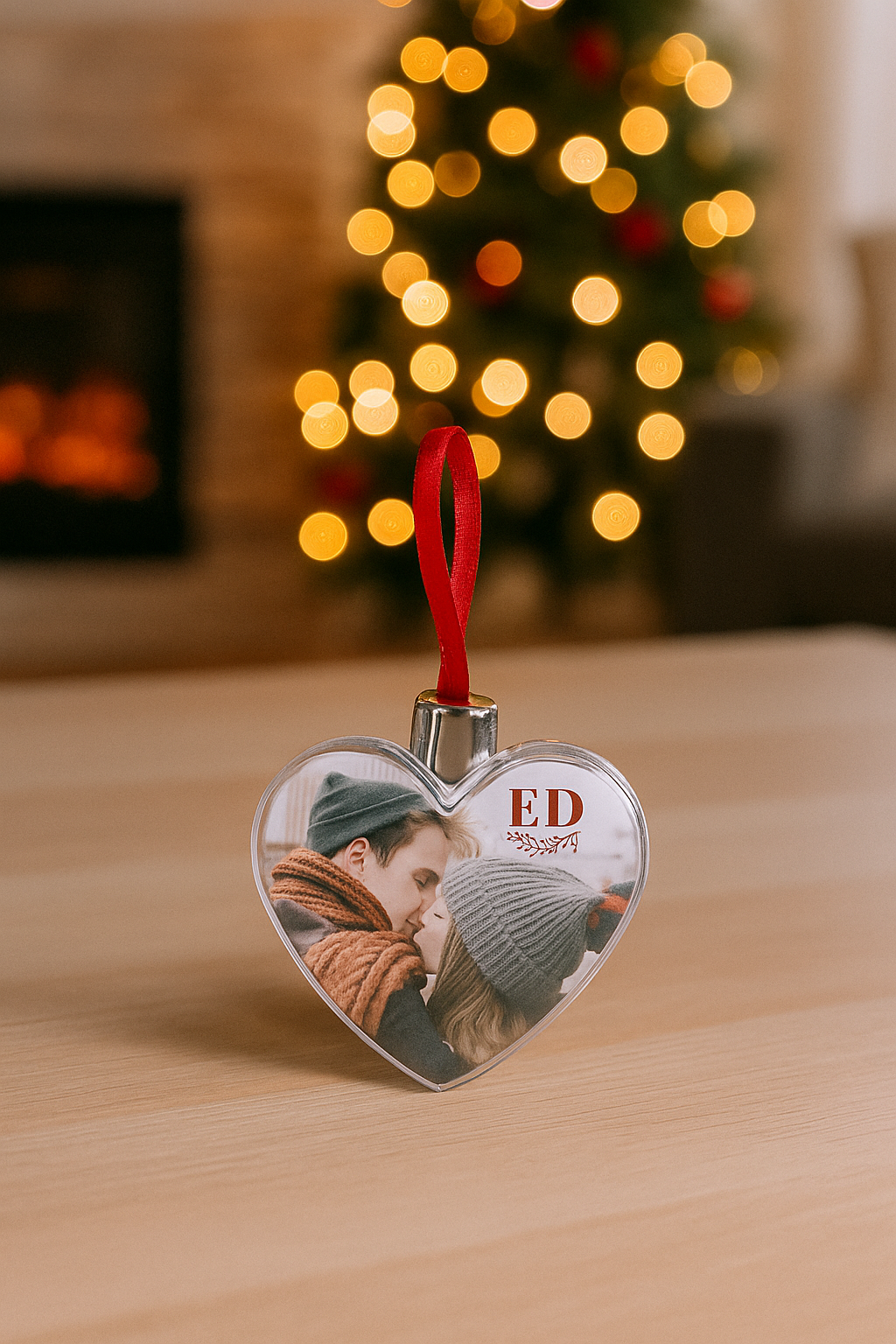 Een glazen kerstbal ( hartjes vorm ) , waarin je een foto kan plaatsen.